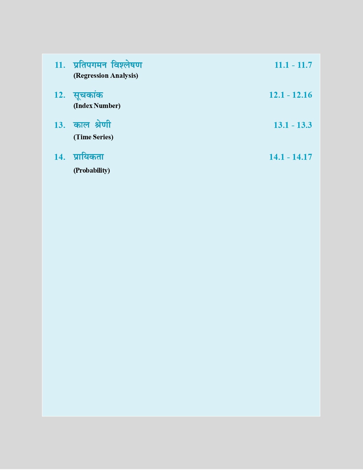 प्रचलित अध्यायों का समावेश: केन्द्रीय प्रवृत्ति, प्रसरण (Dispersion), सहसंबंध (Correlation), प्रतिगमन (Regression), सूचकांक संख्या (Index Number), प्रायिकता (Probability), वर्गीकरण एवं सारणीकरण (Classification & Tabulation) जैसे सभी प्रचलित अध्याय शामिल हैं।